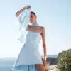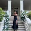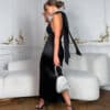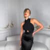 A sophisticated and effortlessly elegant like two-piece look featuring a luxurious black satin skirt and a soft jersey top. The top ties gracefully around the neck in a chic cross-front design, creating a flattering silhouette that highlights the shoulders and neckline. Perfect for special occasions, this outfit combines comfort with refined style, offering a timeless yet modern aesthetic. Dress it up with statement heels and accessories for an unforgettable evening look.